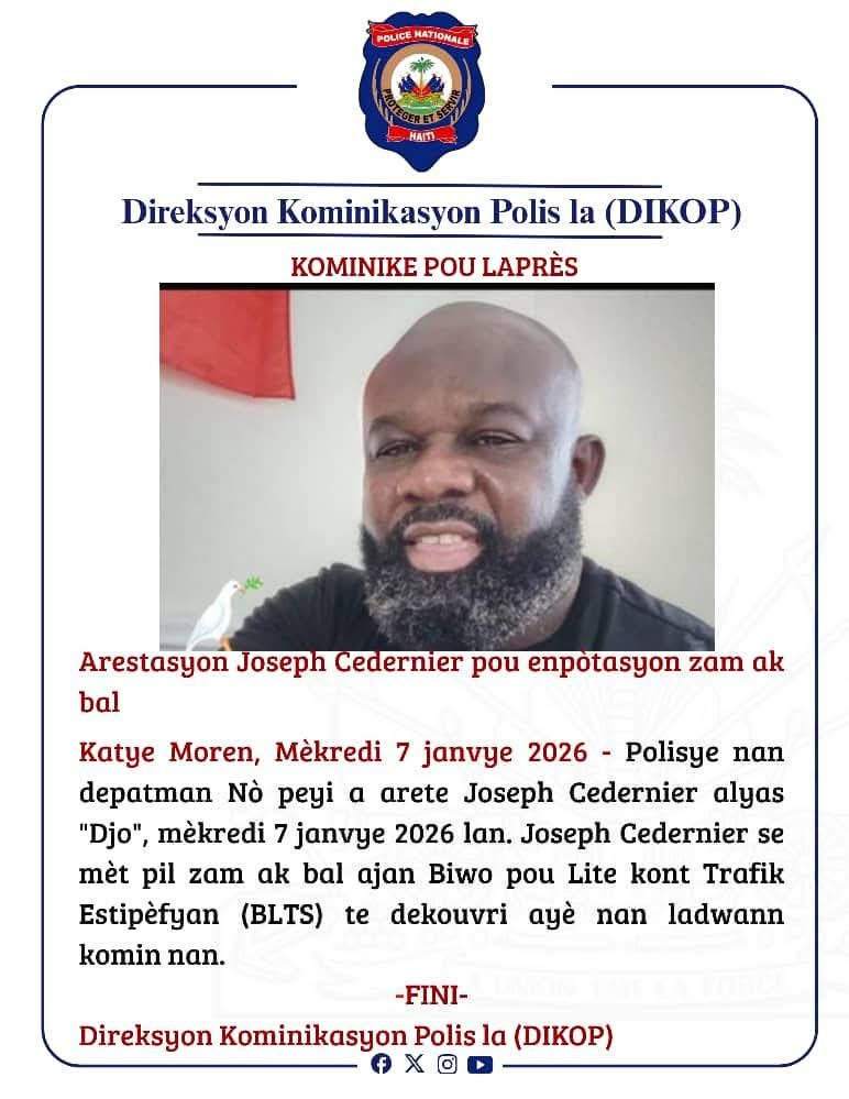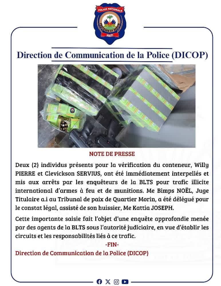 Le mercredi 7 janvier 2026, les forces de l’ordre ont procédé à l’arrestation de Joseph Cedernier, alias « Djo », à Quartier Morin, pour possession illégale d’armes à feu et de munitions. Cette arrestation fait suite à une opération ciblée menée par la BLTS du Nord, ayant permis la découverte d’un important lot d’armes dissimulé dans un conteneur en provenance des États-Unis. Neuf (9) pistolets de marques variées, neuf (9) chargeurs ainsi que 5 500 cartouches de calibre 7.62×39 ont été saisis. Deux individus, Willy Pierre et Clevickson Servius, ont également été interpellés dans le cadre de cette affaire de trafic international d’armes, désormais sous enquête judiciaire approfondie.